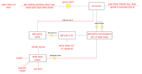 Để đạt được mục tiêu này, dự án áp dụng công nghệ xyclon kết hợp dung dịch hấp thụ NaOH, qua đó nâng cao khả năng loại bỏ các chất ô nhiễm trong dòng khí thải, đồng thời góp phần làm nguội khí trước khi phát tán ra môi trường. Bên cạnh hiệu quả xử lý, việc sử dụng dung dịch hấp thụ với các thông số được kiểm soát chặt chẽ còn giúp bảo đảm tính ổn định và an toàn trong vận hành, qua đó giúp tiết kiệm chi phí vận hành và bảo vệ thiết bị khỏi ăn mòn.